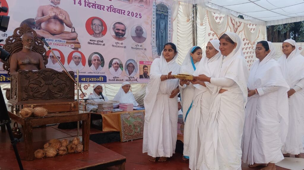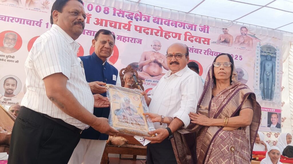 गुरु भक्तों ने आचार्य श्री के पाद प्रक्षालन धर्मेंद्र जी जैन विजय नगर और अन्य भक्तों ने कर शास्त्र भेंट किए,क्षुल्लिका प्रभा श्री माताजी का भी आज दीक्षा दिवस है उन्होंने भी आचार्य श्री को शास्त्र भेंट किया और अशोक कुमार जी सतना वालो ने भी शास्त्र भेंट किए बावनगजा ट्रस्ट कमेटी के अध्यक्ष विनोद दोशी ने स्वागत भाषण प्रस्तुत किया,और बाहर से आए अतिथियों का ट्रस्ट कमेटी ने और चातुर्मास कमेटी ने सम्मान पगड़ी,अंगवस्त्र,मोतियों की माला और तिलक लगा कर किया।